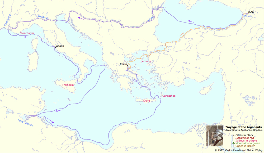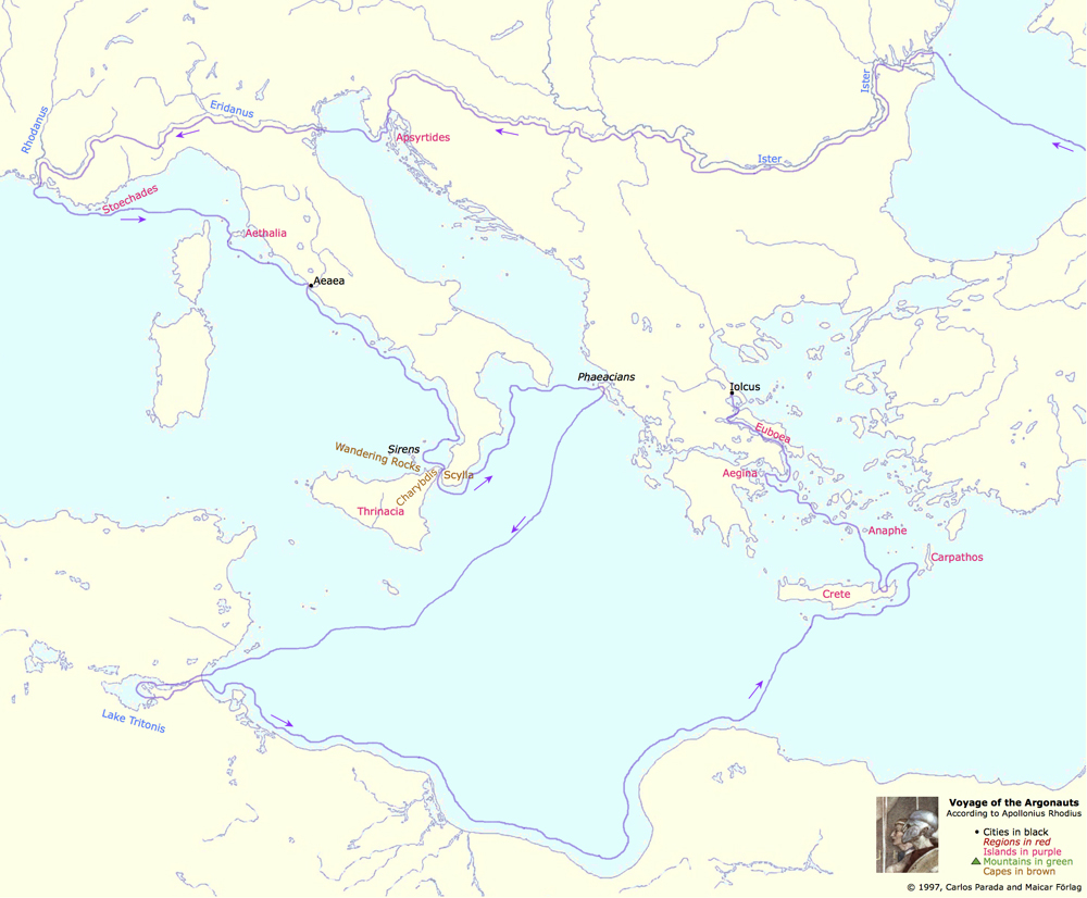 | The ARGONAUTS returned navigating first the river Ister (now Danube). Having reached the sea which is today called Adriatic, they killed Medea's brother in one of the islands that later were called Apsyrtides. They then entered the mouth of the river Eridanus (now Po), and after navigating this river they managed to come to the river Rhodanus (Rhône), and thence to the Mediterranean Sea. Out in the Mediterranean, they sailed past the Stoechades Islands (now Hyères islands, off the southeast cost of the country called France) and Aethalia (now Elba), before reaching Aeaea, Circe's abode, located here in Italy, but otherwise considered as an island of doubtful location. Having sailed past the SIRENS, the Wandering Rocks (Planctae), Scylla and Charybdis, the ARGONAUTS came to the land of the Phaeacians, generally identified with the island of Corcyra or Corfu. After that, they came to the Lake Tritonis in the continent then called Libya but today called Africa. The ARGONAUTS had their last significant adventure in Crete, and thence, sailing past the islands of Anaphe and Aegina and through the straits between the island of Euboea and mainland Greece, they returned to Iolcus. |
