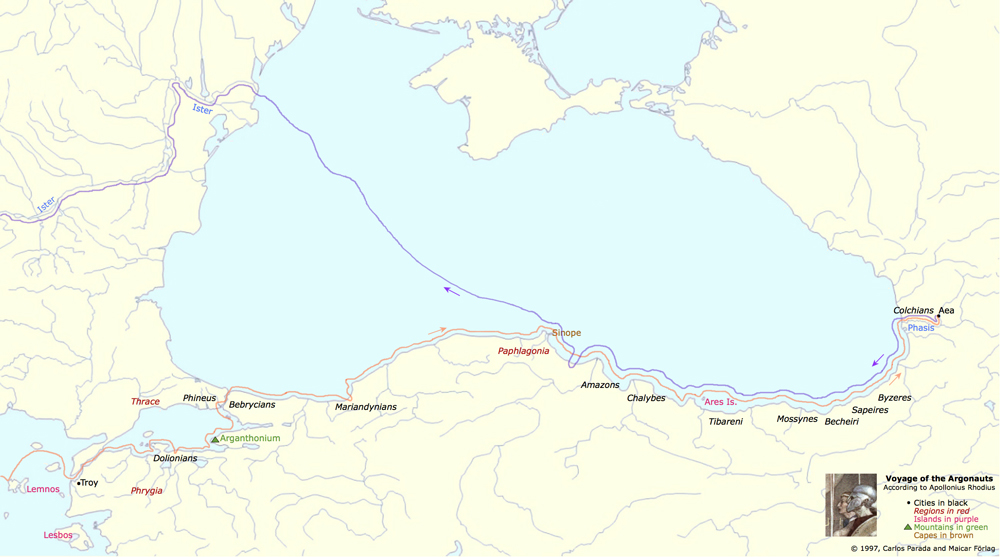 | After visiting the lands of the Dolionians, Bebrycians, and Mariandynians, the ARGONAUTS, passed through the Clashing Rocks (Symplegades) of Bosphorus, and sailed past a number of peoples living in eastern Asia Minor, before reaching the mouth of the river Phasis and the city of Aea in Colchis, where Aeetes was king. On their way home, the ARGONAUTS touched Paphlagonia in northern Asia Minor, before entering the river Ister (now Danube). |