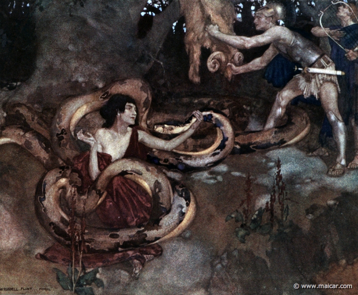After having sailed past the Thermodon and the Caucasus, they arrived to Colchis, which was ruled by King Aeetes, the man who had received from Phrixus 1 the Golden Fleece. When the ARGONAUTS arrived, Jason met Aeetes and invited him to give him the Golden Fleece. Aeetes promised to give it if single-handed he would yoke the brazen-footed bulls (a gift he had received from Hephaestus), and with them sowed the Dragon's teeth (for he had got from Athena half of the dragon's teeth which Cadmus sowed in Thebes). While Jason was trying to figure out how to perform these tasks, Medea, who was the king's daughter and a priestess of Hecate, fell in love with him. The girl then proposed him the following secret: she promised to help him to yoke the bulls and to give him the Golden Fleece, if he would marry her and take her to Hellas with him. And since ambition may give birth to any kind of promises to attain its aims, Jason swore to do so, and Medea gave him a drug to anoint his body, spear and shield with, which would protect him for one day against fire and iron, when he was about to yoke the bulls. Medea also anticipated that, when the teeth were sown, armed men would spring up from the ground against him, and that he should throw stones into their midst from a distance, so that they would fight each other, and that while they were busy in the fight he could draw near and kill them. So Jason, anointed with the miraculous drug, yoke the bulls, and having sown the Dragon's teeth, killed the warriors that came up from the ground, following Medea's instructions. However, Aeetes, who had apparently proposed these tasks only hoping for Jason's destruction, was not willing to give up the Golden Fleece, and started to plan the burning of the "Argo" and the destruction of its crew. But Medea brought Jason by night to the the place where the Golden Fleece hang, and put to sleep by her drugs the Dragon that guarded it. And while the dragon was asleep, the ARGONAUTS took the Golden Fleece, and having come to the ship, they sailed away by night in a hurry.