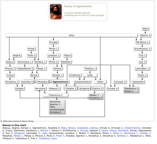Names in this chart: Aeacus, Aegina, Aerope 1, Agamemnon, Anaxibia 4, Atlas, Atreus, Cassandra, Catreus, Chrses 4, Chryseis 1, Clytaemnestra, Cometes 4, Crisus, Daimenes, Dardanus 1, Electra 2, Electra 3, Erichthonius 1, Europa, Halesus 2, Helen, Helius, Hermione, Himas, Hippodamia 3, Ilus 2, Iphigenia, Laomedon 1, Leda, Leontomenes, Lycastus 1, Medon 7, Menelaus, Minos 1, Minos 2, Oenomaus 1, Orestes 2, Pasiphae, Pelops 1, Pelops 2, Phocus 3, Pluto 3, Priam 1, Pylades, Sparton 1, Strophius 1, Strophius 3, Tantalus 1, Teledamus 1, Tellis, Thestius 1, Tisamenus 2, Tros 1, Tyndareus, Zeus.