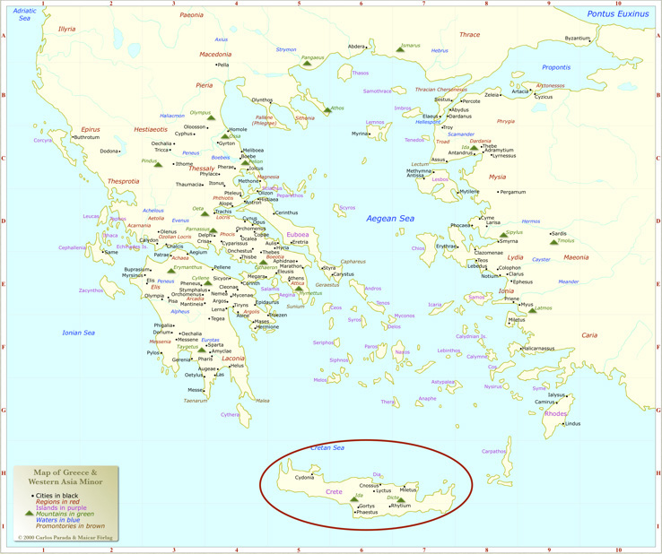 Crete is the large island in the Mediterranean Sea, southeast of Greece. The first Cretan kings were Archedius, Gortys 2, and Cydon 1, sons of Tegeates, the founder of Tegea in Arcadia. Tegeates was son of the impious Lycaon 2, who lived at the time of The Flood (see Mythical Chronology). The three brothers emigrated from Arcadia to Crete, and it is said that the city Gortyna was named after Gortys 2, and Cydonia after Cydon 1.