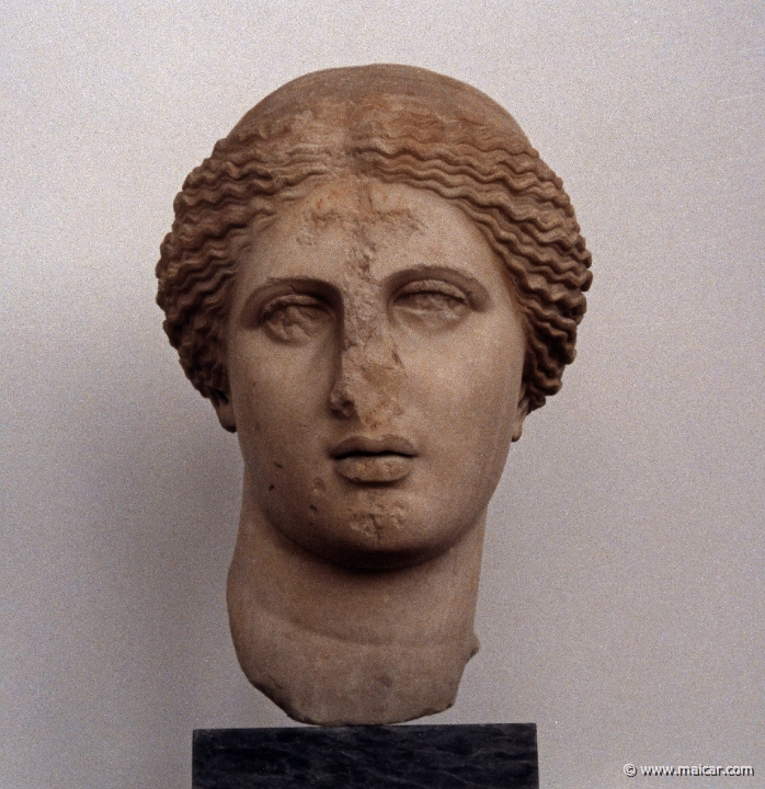 Aphrodite, the goddess of love, with a cross on her forehead incised by the first Christians. 6228: Head of Aphrodite. Roman copy of a Praxitelian original of the 4C BC. The first Christians incised two crosses on the forehead and chin of the statue of the goddess. Found at the Roman Agora of Athens (by the so called Tower of the Winds), 2C AD. National Archaeological Museum, Athens.