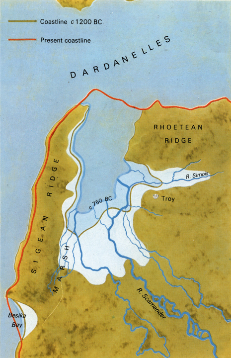Map of the plain of Troy showing the changes that have taken place over time. The green line shows the coastline in 1200 BC. This map appears in Peter Connolly's rich illustrated book The Ancient Greece of Odysseus (Oxford University Press, 1998).